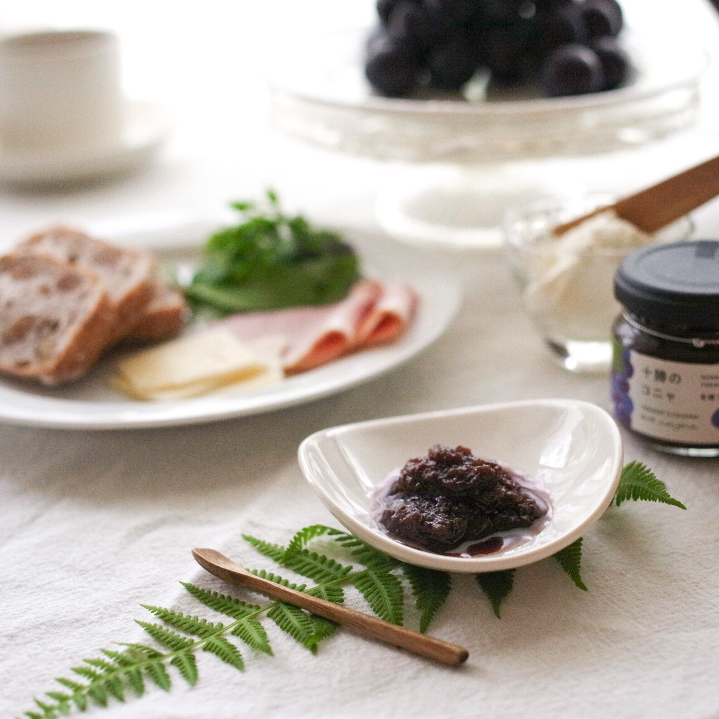 十勝池田町で品種改良されたワイン用ブドウ『山幸』、十勝産のリンゴやプラムを贅沢に使用。シナモンやクルミなども加えているのでチーズやパン、焼き菓子などに塗って食べるなど、十勝地域の名産品と相性が非常に良い商品です。